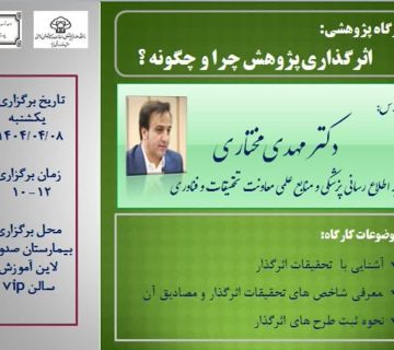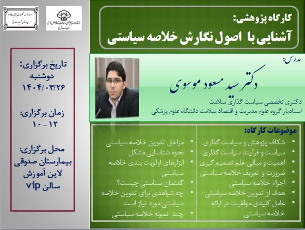 کارگاه پژوهشی”آشنایی با اصول نگارش خلاصه سیاستی” با تدریس جناب آقای دکتر سید مسعود موسوی (دکتری تخصصی سیاست گذاری سلامت و استادیار گروه علوم مدیریت و اقتصاد سلامت دانشگاه) در تاریخ دوشنبه 1404/03/26 ساعت 10-12 در محل لاین آموزش سالن vip بیمارستان شهید صدوقی برگزار می گردد.