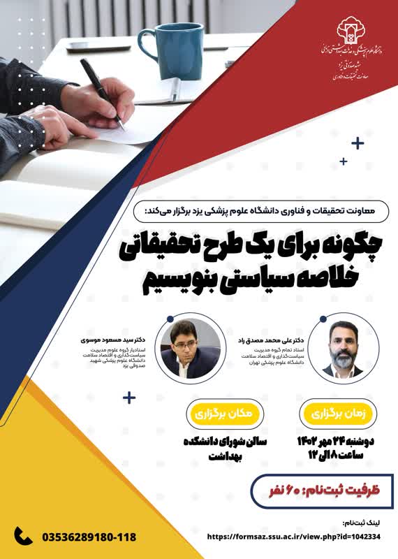 چگونه برای یک طرح تحیقاتی خلاصه سیاستی بنویسیم؟مدیر کتابخانه دیجیتال18 مهر 1402چگونه برای یک طرح تحیقاتی خلاصه سیاستی بنویسیم؟ مدرسین: دکتر علی محمد مصدق ... اطلاعات بیشتر