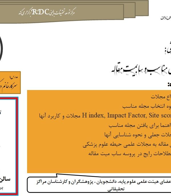 کارگاه پژوهشی انتخاب ژورنال مناسب وسابمیت مقالهمدیر کتابخانه دیجیتال26 آبان 1402کارگاه پژوهشی انتخاب ژورنال مناسب وسابمیت مقاله مدرس :سرکار خانم دکتر پریسا خانی ... اطلاعات بیشتر