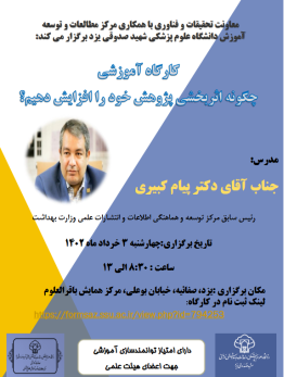 کارگاه آموزشی چگونه اثر بخشی پژوهش خود را افزایش دهیم؟مدیر کتابخانه دیجیتال24 مرداد 1402کارگاه آموزشی چگونه اثر بخشی پژوهش خود را افزایش دهیم؟ مدرس دکتر پیام ... اطلاعات بیشتر