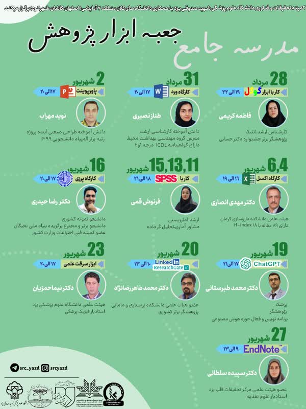 مدرسه جامع جعبه ابزار پژوهشمدیر کتابخانه دیجیتال25 مرداد 1402مدرسه جامع جعبه ابزار پژوهش علوم پزشکی شهیدصدوقی یزد باهمکاری دانشگاههای کلان منطقه ... اطلاعات بیشتر