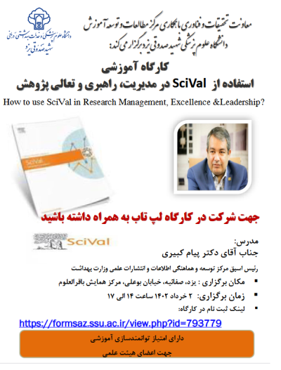 کارگاه آموزشی استفاده از Scival در مدیریت،راهبری و تعالی پژوهشمدیر کتابخانه دیجیتال24 مرداد 1402کارگاه آموزشی استفاده از Scival در مدیریت،راهبری و تعالی پژوهش مدرس دکتر پیام ... اطلاعات بیشتر