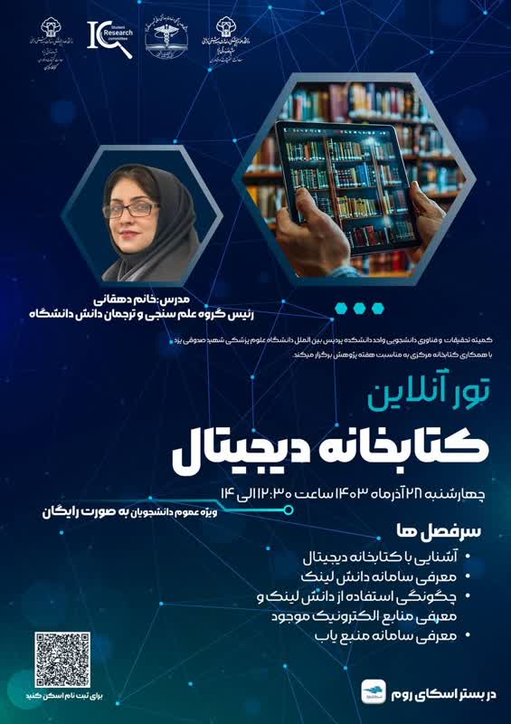 تور آنلاین کتابخانه دیجیتالمدیر کتابخانه دیجیتال24 آذر 1403کمیته تحقیقات و فناوری دانشجویی دانشگاه علومپزشکی شهیدصدوقی یزد به مناسبت هفته پژوهش ... اطلاعات بیشتر