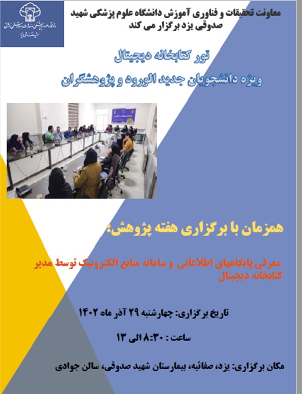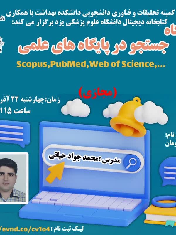 کارگاه جستجو در پایگاه های علمیمدیر کتابخانه دیجیتال20 آذر 1402کارگاه جستجو در پایگاه های علمی کمیته تحقیقات و فناوری دانشجویی دانشکده بهداشت ... اطلاعات بیشتر