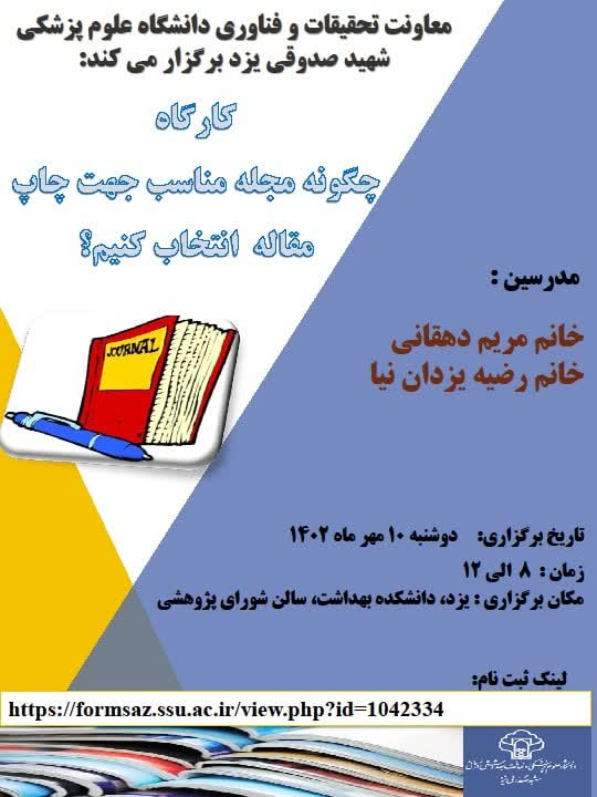 کارگاه چگونه مجله مناسب جهت چاپ مقاله انتخاب کنیم؟مدیر کتابخانه دیجیتال5 مهر 1402چگونه مجله مناسب جهت چاپ مقاله انتخاب کنیم برنامه کارگاه ویژه کارشناسان پژوهشی ... اطلاعات بیشتر